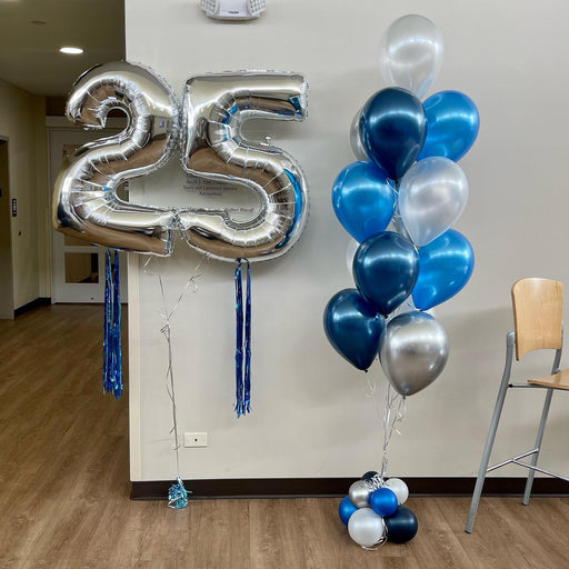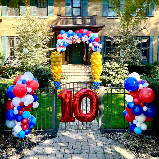 A balloon arch in the class colors of red and royal blue surrounds a metallic fringe to create the perfect balloon photo-op. Helium balloon numbers...