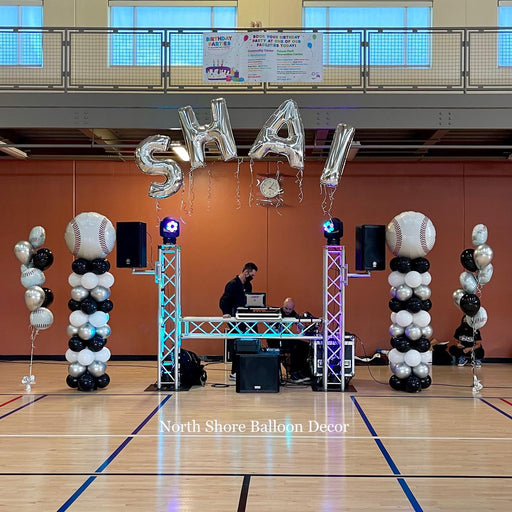 Sports Gymnasium Bar Mitzvah Columns, Helium Bouquets & Floating Name Arch